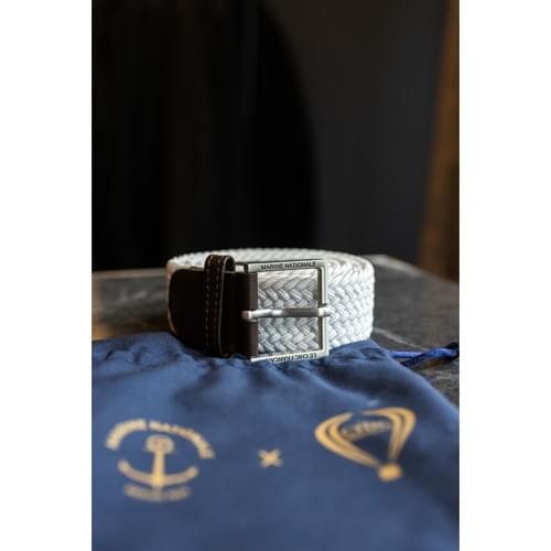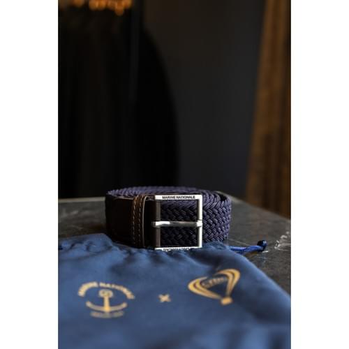 Réalisée en tissu tressé, cette ceinture se distingue par son savoir-faire français et sa boucle en métal embouti, gravée du double lettrage de la collaboration : Le Chic français et Marine nationale.