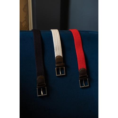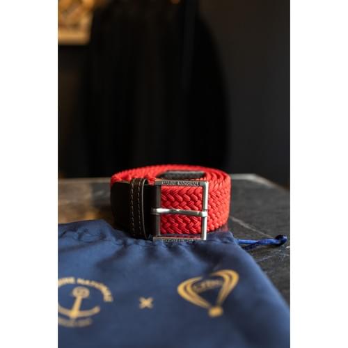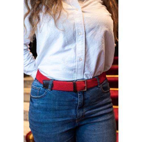 Ceinture rouge tressée, teintée dans la masse, finition cuir véritable. Tresse élastique ( Polypropylène et Elasthanne ) Manufacturée en France, alliant CHIC et CONFORT !